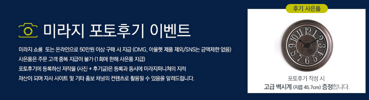 미라지 매장 또는 자사몰에서 50만원 이상 구매 시 사은품(원형 벽시계)을 드립니다. [ * 매월 베스트 포토리뷰 5명은 고급 램프 증정 ]